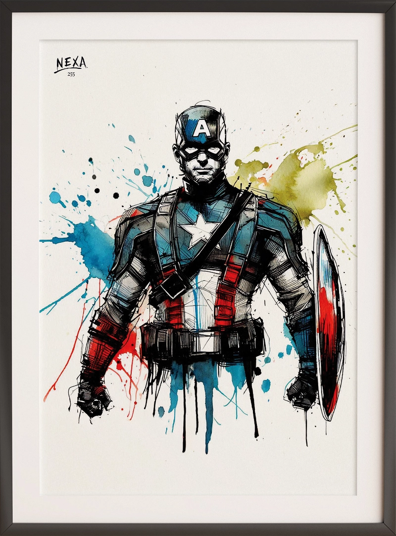Captain’s Stand captures the unwavering strength and valor of a legendary super soldier. Rendered with bold ink strokes and splashes of vivid red, blue, and white, this portrait evokes a sense of duty, justice, and heroism. The iconic shield and signature star mark him as a timeless symbol of protection and leadership.