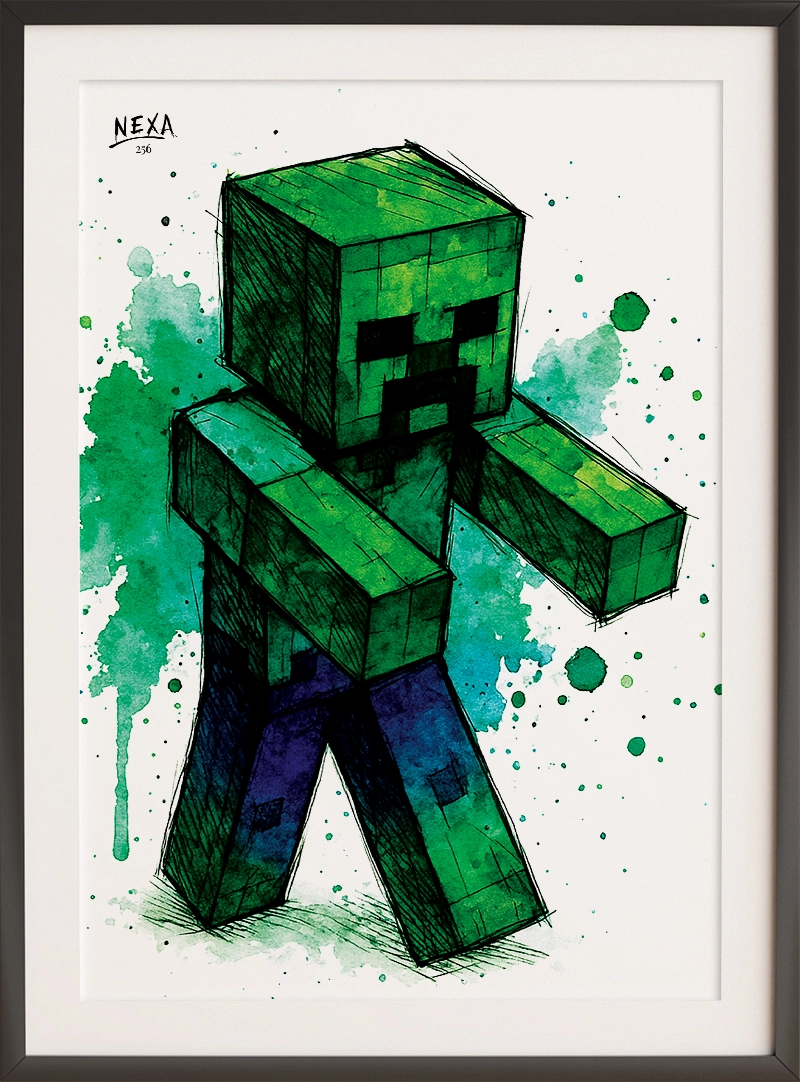 Minecraft Zombie is a bold and blocky tribute to one of the game’s most recognizable mobs. Painted with strong ink outlines and vibrant watercolor washes, this A4 printable captures the zombie’s menacing posture, square face, and green-toned skin as it emerges from a splash of emerald and teal.