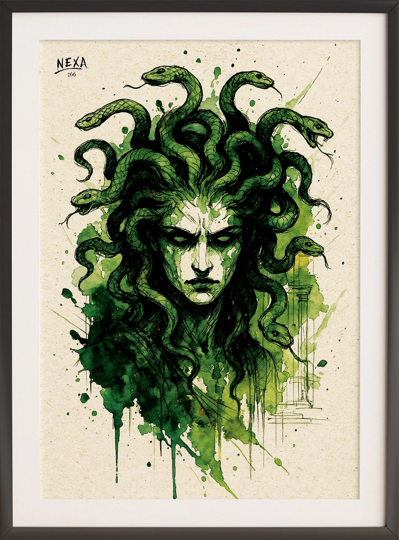 Medusa Poster brings to life the iconic Greek myth with a chilling elegance. Her snake-like hair twists around her face in flowing ink strokes, while splashes of green watercolor evoke both poison and mystery.