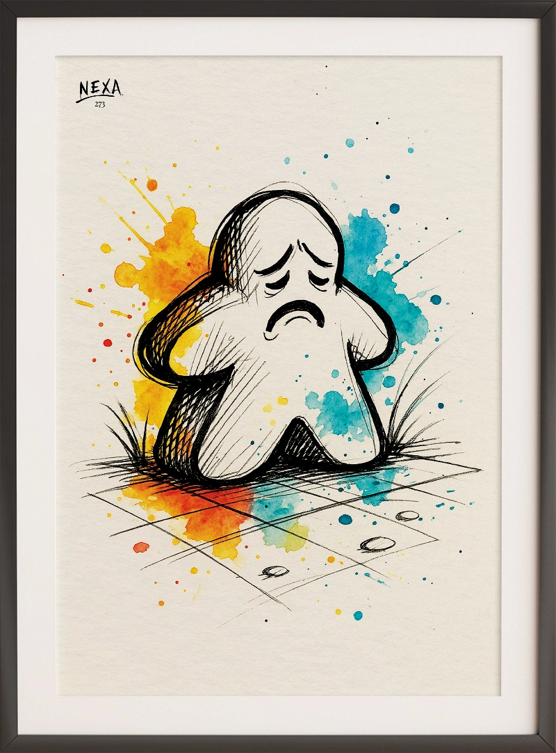 Sad Meeple expresses the emotional lows that come with every great game. This little wooden figure slumps on the board, framed by bold ink lines and colorful watercolor splashes, echoing feelings we all know — the last place, the unlucky roll, the moment of silence after a defeat.